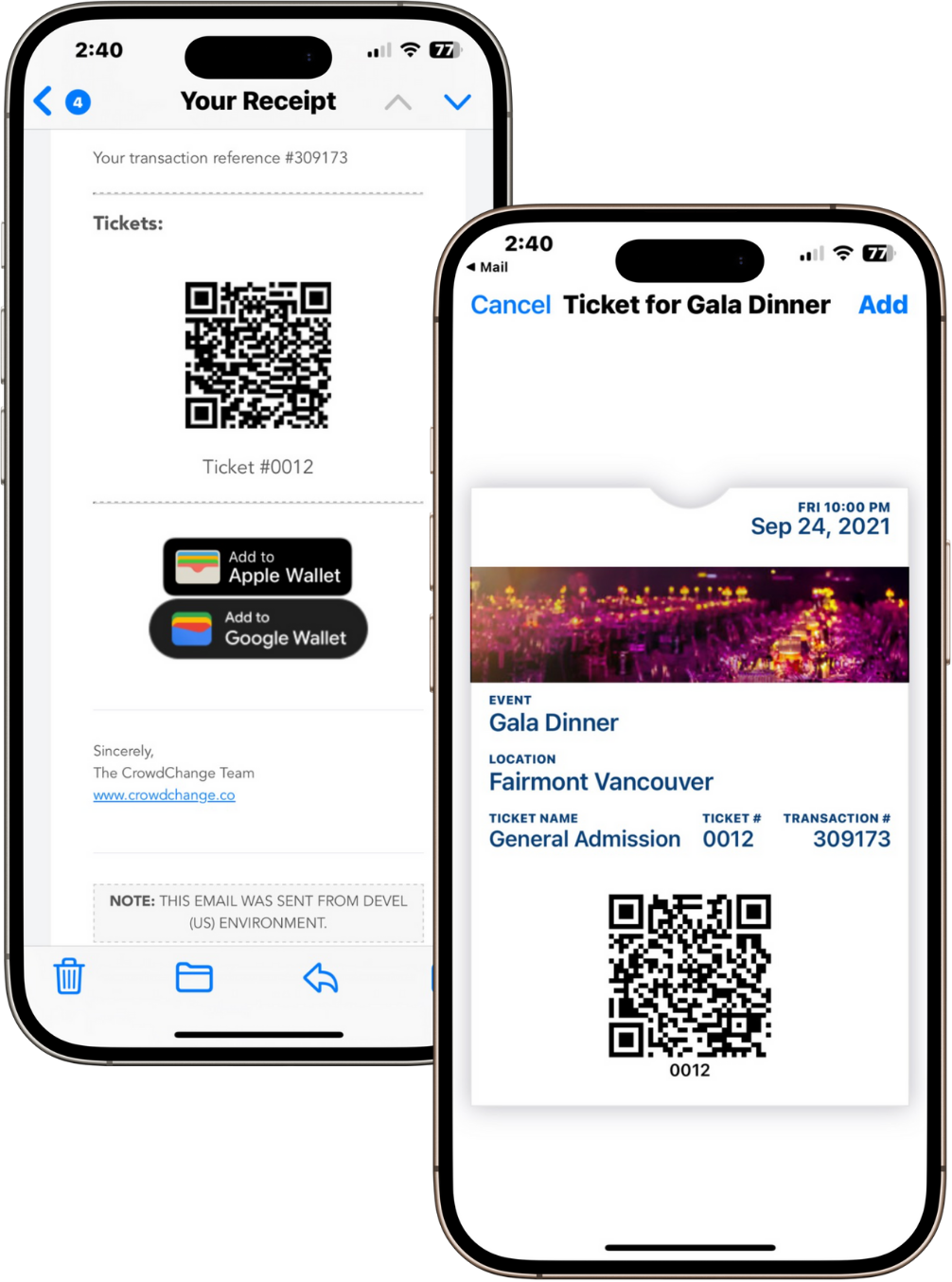 Offrez à vos invités une expérience événementielle fluide grâce à des billets numériques qu'ils peuvent ajouter directement à Apple Wallet. Avec CrowdChange, les participants peuvent stocker leurs billets en toute sécurité sur leur téléphone pour un accès rapide et une lecture rapide du QR code à l'enregistrement, sans avoir à consulter leurs e-mails.